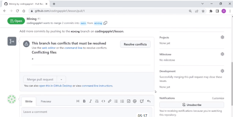 따라서, github에서 Pull request 클릭 ( merge 요청임)
