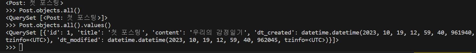 python manage.py shell -> 장고에서 데이터베이스와 소통