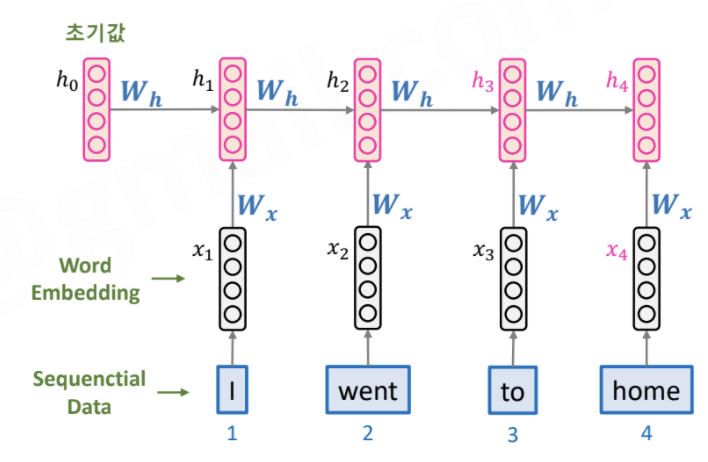 - Wx, Wh, bh 는 모두 같은 값으로 모델이 Recurrent하게 사용됨