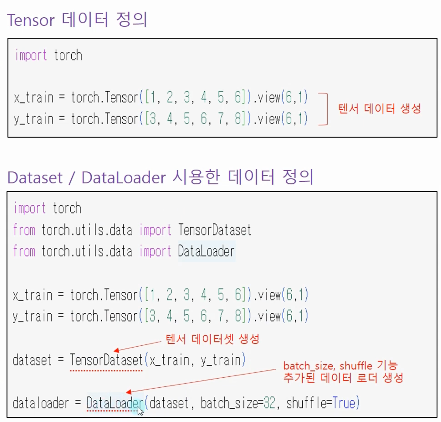 TensorDataset과 DataLoader를 제공 -> 미니 배치 학습, 데이터 셔플, 멀티 프로세싱을 간단하게 수행 가능